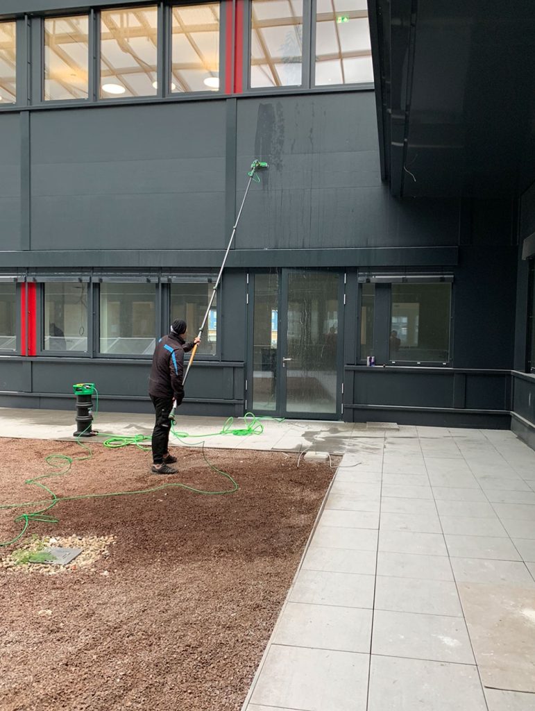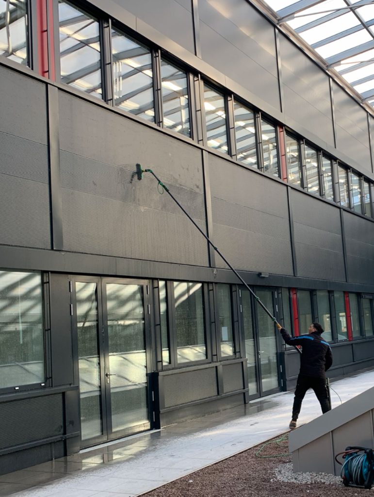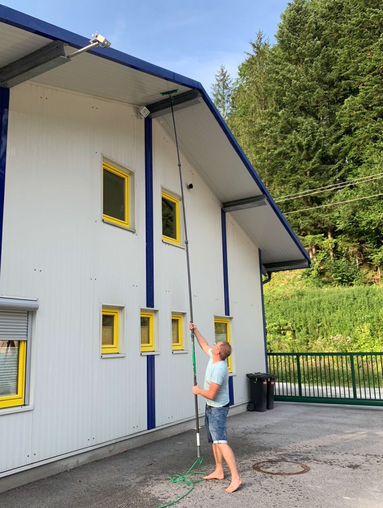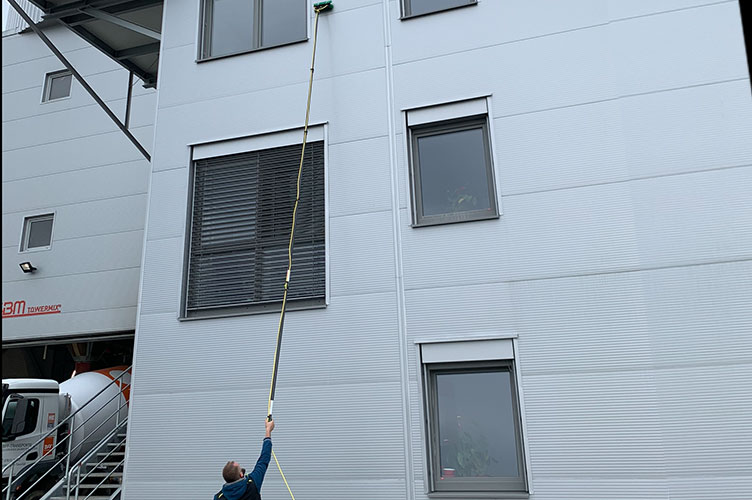 Unsere geschulten Putzperlen arbeiten diskret, effizient und mit höchster Präzision, sodass jede Fassade makellos, strahlend und repräsentativ ist.Mithilfe unserer wasserführenden Teleskopstange erreichen wir Höhe von bis zu 16 Metern.